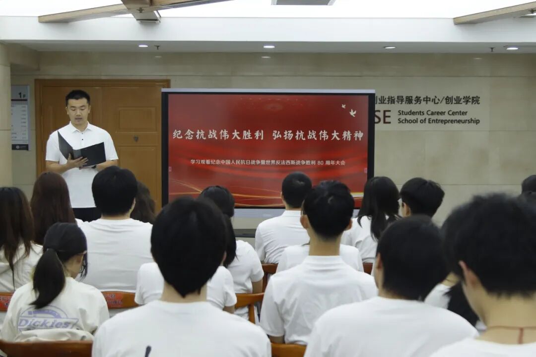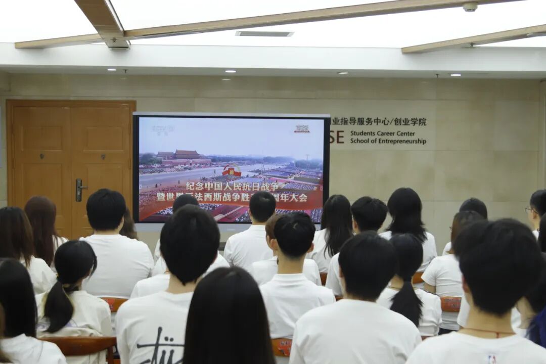 9月3日上午,纪念中国人民抗日战争暨世界反法西斯战争胜利80周年大会在北京天安门广场隆重举行。为深切缅怀革命先烈,弘扬伟大抗战精神,激发青年学子的爱国精神,校团委统一组织各学生组织和社团代表,通过网络直播共同观看纪念大会。